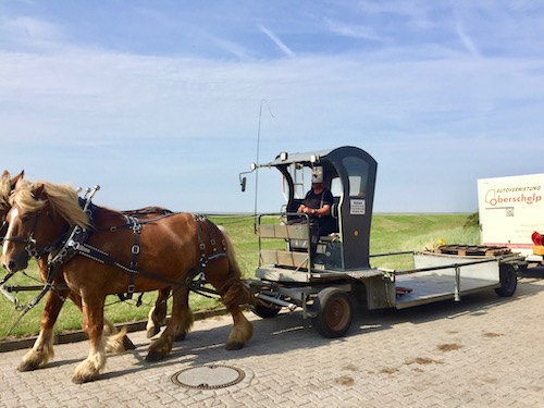 Das gibt es bei uns auch nicht alle Tage, dass unsere Möbel mit dem Pferdefuhrwerk anreisen. Wir durften auf der Insel Juist einige Feriendomizile ausbauen. Und die ist autofrei, also musste alles Material und Werkzeug in den Hänger, dann auf die Fähre und schließlich hat es der Spediteur mit den Pferden zur Baustelle gebracht.
